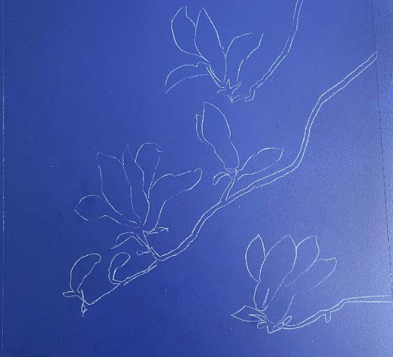 1 | On a surface primed and roller-coated with two coats of Golden Paintworks Mural & Theme Paint Royal Blue, sketch a blossom and branch design with a white chalk pencil.
