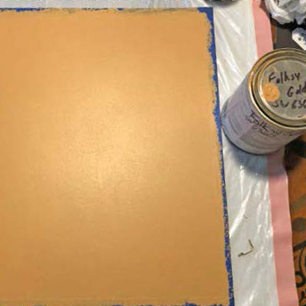 6 | Mix the Glazing Medium with Slow Dry Fluid Acrylics in Raw Umber to desired color. Apply liberally to the surface and while wet, pull off desired amount of glaze using a damp stain pad or sponge, pulling off in a vertical movement and then across with a horizontal movement to create a linen look. Let dry.