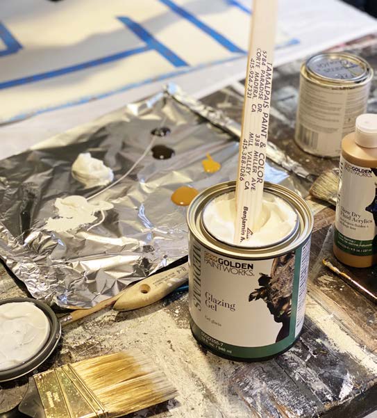 3 | Decide which areas will be darker horn or lighter horn and tape the areas you will work on first. The low-tack tape protects the area next to it from being painted, and when repeated for the next paint area, it adds to the inlay look. If you look at horn closely, it has a natural curve, so our color layering is curved. In this photo, we are using highlights of the Burnt Sienna mix over a dry Carbon Black mix. For others, we used the Rich Cream as a base. Every color has a designated brush and there is one brush to merge each area with several colors. Once that area is dry, tape the next area, choose the colors and paint. Do the curve in another direction, so it looks inlaid.